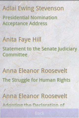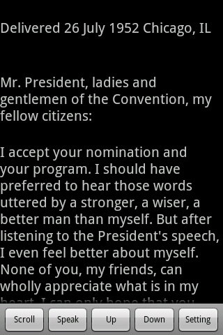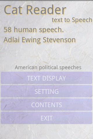 This application has a texttospeech feature of Android.TTS engine support.DescriptionCatReader texttospeech, the best Android reader CatReader offers you abundant Speech resource, best reading experience and excellent books management.Onetouch selection famous book is often read.Automatic scroll, does not require cumbersome page turns.This application has a texttospeech feature of Android.TTS engine support.Keep your eyes health setting for longtime reading.58 human speechAdlai Ewing StevensonAnita Faye HillAnna Eleanor RooseveltAnna Howard ShawBarbara Charline JordanBarbara Pierce BushBarry Morris GoldwaterCarrie Chapman CattCesar Estrada ChavezClarence Seward DarrowCrystal EastmanDorothy Ann Willis RichardsGeneral Douglas MacArthurDwight David EisenhowerEdward Moore KennedyEliezer quot;Eliequot; WieselElizabeth GlaserElizabeth Gurley FlynnEmma GoldmanEugene Victor DebsFranklin Delano RooseveltGeorge Catlett MarshallGerald Rudolph ford Geraldine Anne FerraroHarry S. TrumanHenry Louis quot;Louquot; GehrigHillary Diane Rodham ClintonHubert Horatio HumphreyHuey Pierce LongJesse Louis JacksonJimmy Earl CarterJohn Fitzgerald KennedyJohn Llewellyn LewisJoseph N. WelchLyndon Baines JohnsonMalcolm XMargaret Chase SmithMargaret Higgins Sangermario Matthew CuomoMario SavioMartin Luther King, Jr.Mary Church TerrellMary FisherNewton Norman MinowRichard Milhous NixonRobert Francis KennedyRobert Marion La FolletteRonald Wilson ReaganRussell H. ConwellShirley Anita St. Hill ChisholmSpiro Theodore AgnewStokely CarmichaelTheodore RooseveltThomas Woodrow WilsonUrsula Kroeber Le GuinWilliam Cuthbert FaulknerWilliam Jefferson ClintonWilliam Jennings Bryan