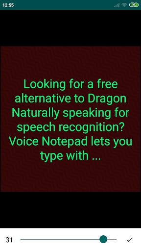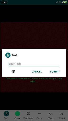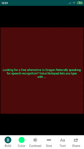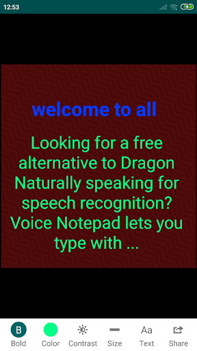 Speech Recognize to turn speech into text design with letter size increase or decrease and letter color change and add or edit new text to share image option can be sent as an Whatsapp or SMS or Email or copied and pasted into another app.