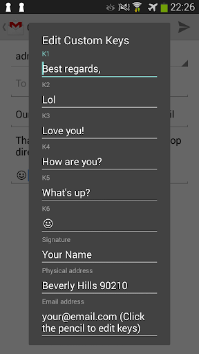 Have your email address, signature, common phrases, names or professional terms pre-defined and insert them whenever you want in a single click - on their corresponding custom key.