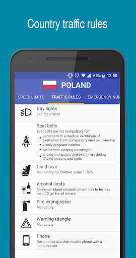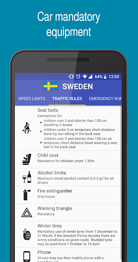 - traffic rules and mandatory equipment (usage of day lights, maximum blood alcohol content, seat belts, child seats, winter tires, safety west/jacket, first aid kit, warning triangle, snow chains etc.)