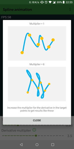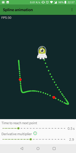 the animator creates a path that passes through these. The set of points is populated runtime by user's tap position. It's possible to change animation speed and a multiplier to increase the derivatives in junction points.