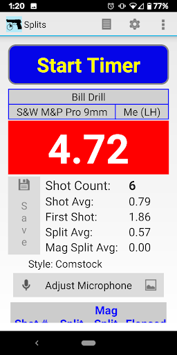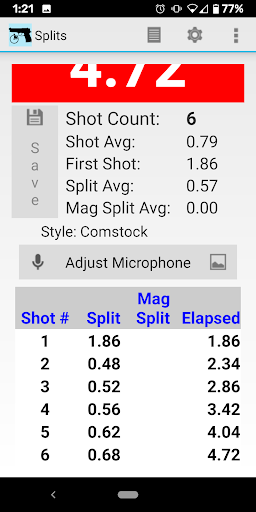 Splits is a shot timer. In fact, Splits is more than just a shot timer. Splits records the time of your first shot, shot to shot split times, mag changes, elapsed times and even includes a simple means to record accuracy. Splits can save your shot strings to your device’s storage (permission required) so that you can monitor your progress.