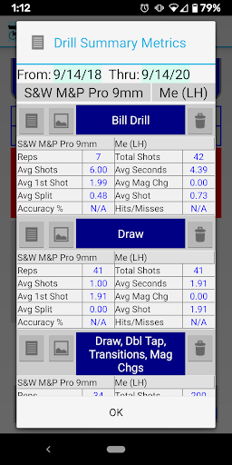 The metrics that Splits retains by Drill include: Total reps of the drill, total shots in the drill, average shots per drill, average elapsed seconds per drill, average first shot, average mag change, average split time between shots (excludes first shot and mag changes), average shot or split time, accuracy and the ratio of hits to misses. The metrics can be filtered by date range, weapon and/or person.