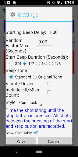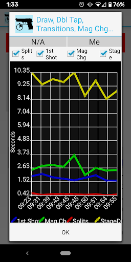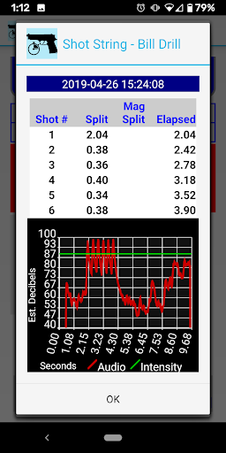 Graphical presentation is integral with Splits. You can see a historical presentation of your progress for draw time, split time, mag changes and elapsed time. You can recall and depict a graph of the actual shot string (2018 and forward). Plus, you can depict a graph of the current shot string and adjust the phone’s sensitivity if needed.