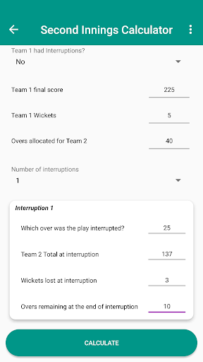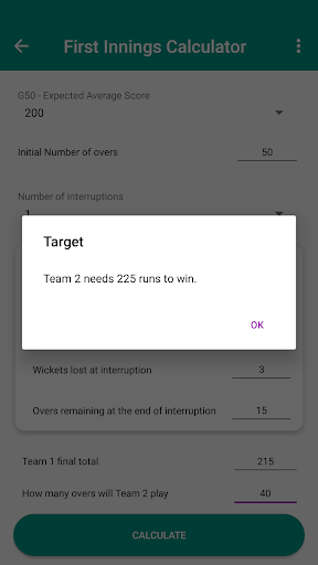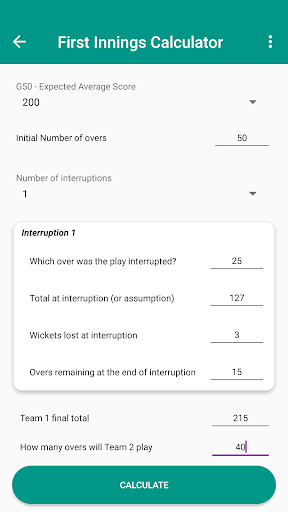 This app can be used to calculate first innings scores in case of interruptions and par scores for second innings.