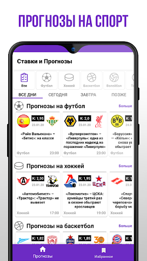 In our application you will find the maximum number of predictions for all the leading football championships, hockey leagues KHL and NHL, basketball Euroleague and NBA. We do not ignore volleyball, tennis, handball and baseball. Follow the forecasts every day!