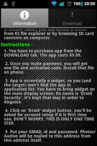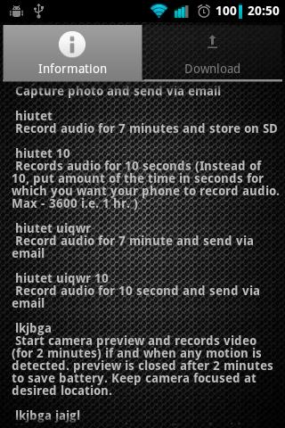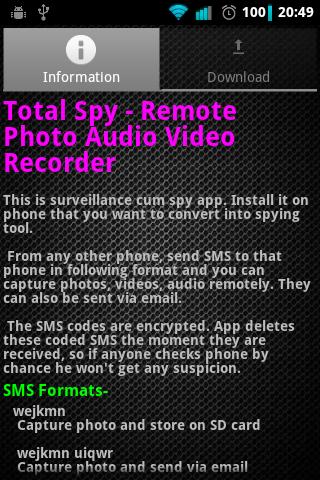 This is informative app. Instructions on how to download our SPY cum SURVEILLANCE app are given in this free version Description about real app This is SPY cum surveillance app. Install it on phone that you want to convert into spying device.From any other phone, send SMS to that phone in given format and you can capture photos, videos, audio remotely. The files are stored on SD card in secret hidden folder. They can also be sent via email remotely.For example, if you send this SMSquot;hiutet uiqwrquot;then the phone will record audio for 7 minute and mail it to you. You can just leave your phone in meeting place or say dining table and use it for spying remotely using ENCRYPTED TEXT messages. It39;s totally stealthy.All the formats are explained in this app.The SMS codes are encrypted. App deletes these coded SMS the moment they are received, so if anyone checks phone by chance he won39;t get any suspicion. This is informative app. You can purchase real app either from this app or from this link http:www.androidlicenser.comapppage88 Keywords remote recorder, photo, video, audio, spy, surveillance, SMS, encryption, code, secret, security, stealth, text, messages, hide privacy, detective