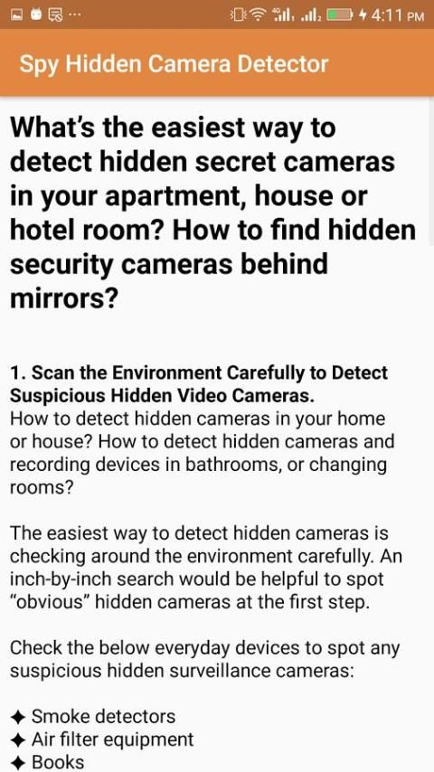Get for free hidden camera detect app on android phone With the help of this Spy Camera Detector you will find hidden cameras like Infrared Cameras and any other camera.