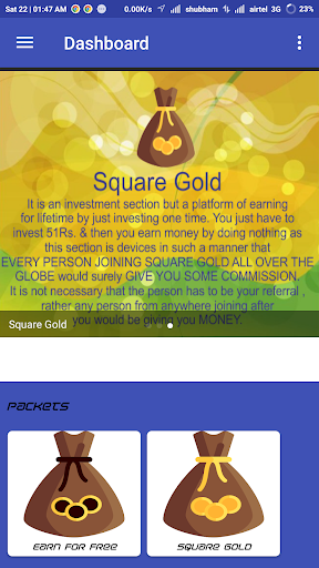2) Square Gold - This is a fixed income source for Everyone. Just invest Rs. 51 for one time and with every person joining from any where in the globe would give you some money. And after that also, you don't have to wait as you can watch Videos & Earn Even more.