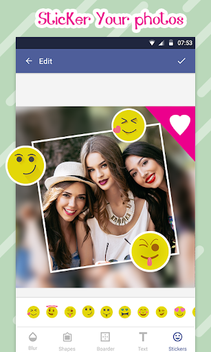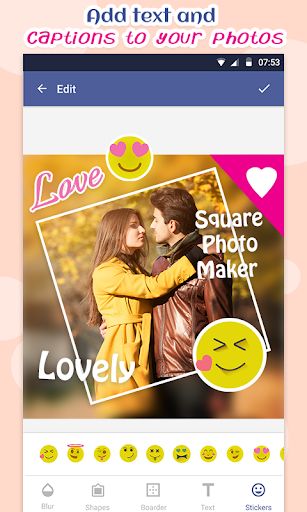 With this Square Photo maker, just click a captured photo or selected photo from gallery and then crop your photo to become square with blurred version of the same photo on the background. You can add additional effects such as emojis, Fun stickers, photo effects,text and able to change or resize frame colors of your square frames. You can also save those photos to device and share them with your friends and family on social networks!