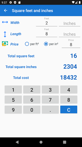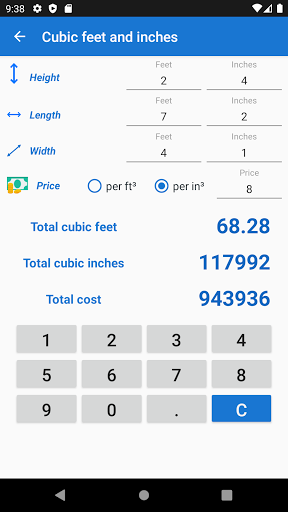 You just have to set the width, height in feet and inches, and the area will be displayed instantly. Height should also be set to calculate the volume.