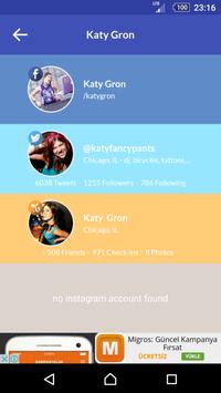 This beta version of profile finder will help you to find Facebook, Twitter, Instagram and Foursquare accounts. Let's stalk!