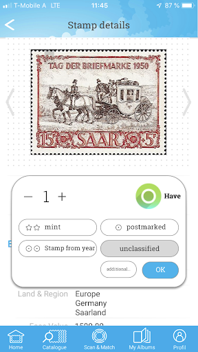 • Price comparisons: whether unused, pasted or stamped. The current estimated collector value will be displayed immediately for many stamps.