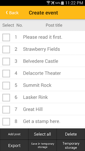 Posts, which can include photos or videos, can be made at [create event] and these posts can be exported as a single event file. Users who download an event file on their Smartphone can check the posts inside the file at [event list], but to do so, conditions set by the creator must be satisfied first. Possible conditions set by the creator can be [open after reading specific posts], [open at specific location], [open at specific time], [open with password], [open after taking photo] or [open after answering question]. Among them, the location for [open at specific location] can be set as a place without a network connection (i.e. mobile communication and Wi-Fi).