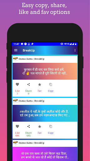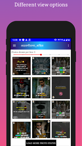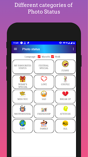 The app contains Marathi status in different formats like text status, photo status. The app also contains different categories of status that is love, couple, sad, motivation and much more.