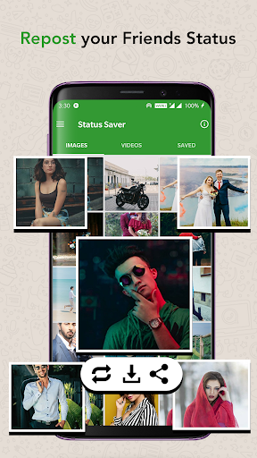 Save image and video from the WhatsApp statuses of your chat-list with a few taps. With our app's help, you can also share or repost WhatsApp story right from the app.