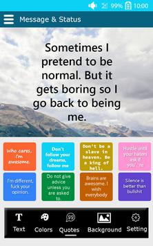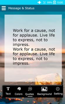Use Status for Whatsapp to really center your thoughts and let these positive affirmations lift you up towards your life's desires. These quotes if read on a regular basis will bring in lot of positive in your life and help you succeed. To enter the Enliven Technique, simply press the animation on the Quote screen for one second.