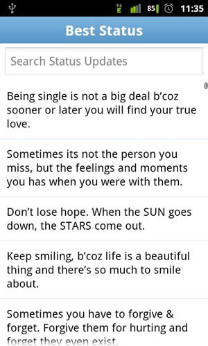 Status updates allows users to post messages on fb wall for their friends to read. The friends can respond with their own comments, as well as click the "Like" button. Originally, the purpose for this statuses to share is to allow users to inform their friends of their current statuses, including feelings, whereabouts or actions. From this app you can easily get creative texts and quotes to set as your best Facebook statuses. Brighten the day of your loved ones by posting the most hilarious and funny quotes for facebook statuses, tagging them.
