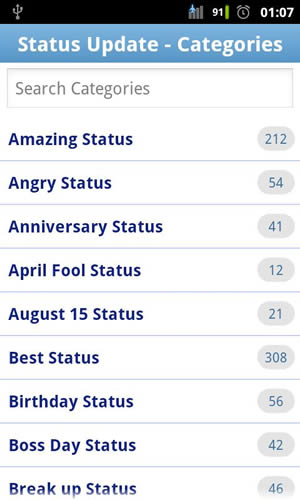 Share Statuses, Quotes and sayings for Facebook via SMS text messaging, Watsapp, Facebook, Twitter,etc.