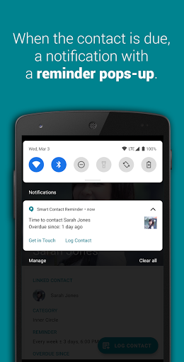 When the contact is due, a notification shows to remind you it is time to reconnect with your contact. You can get in touch straight from the notification using your favorite messaging application or make a call. There is a direct integration with your e-mail client, SMS and phone app (along with several popular messaging platforms) available. Or better yet, meet them in person!