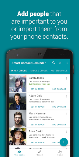 Smart Contact Reminder allows you to either add contacts individually or use the batch import feature to add existing contacts from your phonebook. Use predefined categories - which we call circles - to sort your contacts according to the strength of your relationship. Every circle has an adjustable reminder interval.