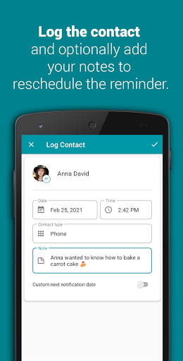 After reconnecting, a log should be created to schedule the next reminder. Logging a contact is easy with our 'Automatic contact detection’ feature which uses notifications from other apps to figure out if you’ve been in touch with your contacts.