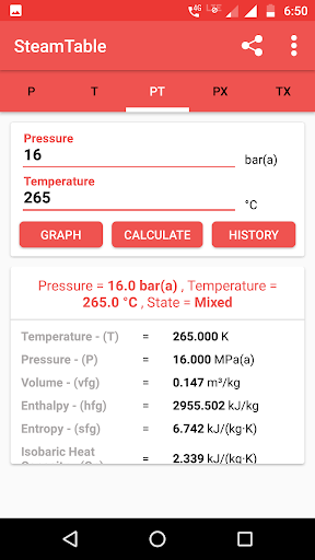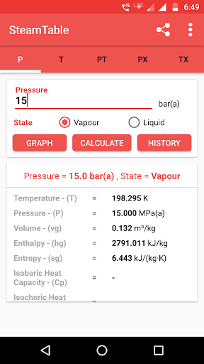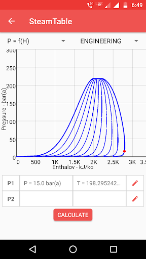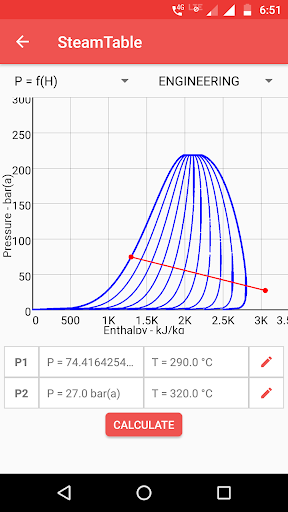 A steam table is an app that helps you calculate water's thermodynamics property using the collection of experimental data on temperature, pressure, volume, and the energy contained in water and steam. It is based on a scale of either absolute or relative pressure. Steam Table app helps you find the steam temperature, steam pressure based on the value entered. It also gives the volume of water and steam at various temperatures and pressures, which is useful for calculations in thermodynamics. This app works as your portable steam table to calculate enthalpy and entropy.