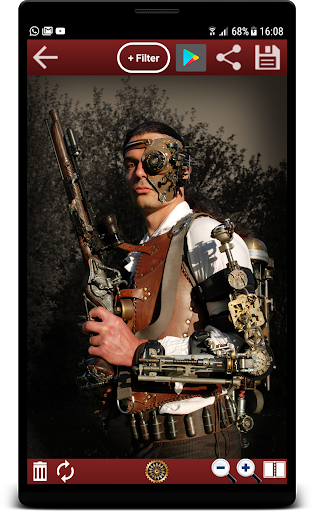Easy shoot a Photo or select one from Gallery. Add new Steampunk Stuff and Stickers with the Gear-Button at the bottom center. Place the Items on the position you want, add more Steampunk Stuff or save with the top right Save-Button. Apply Filter with the Filter Button on top or share with your friends as many modified Pictures like you want.