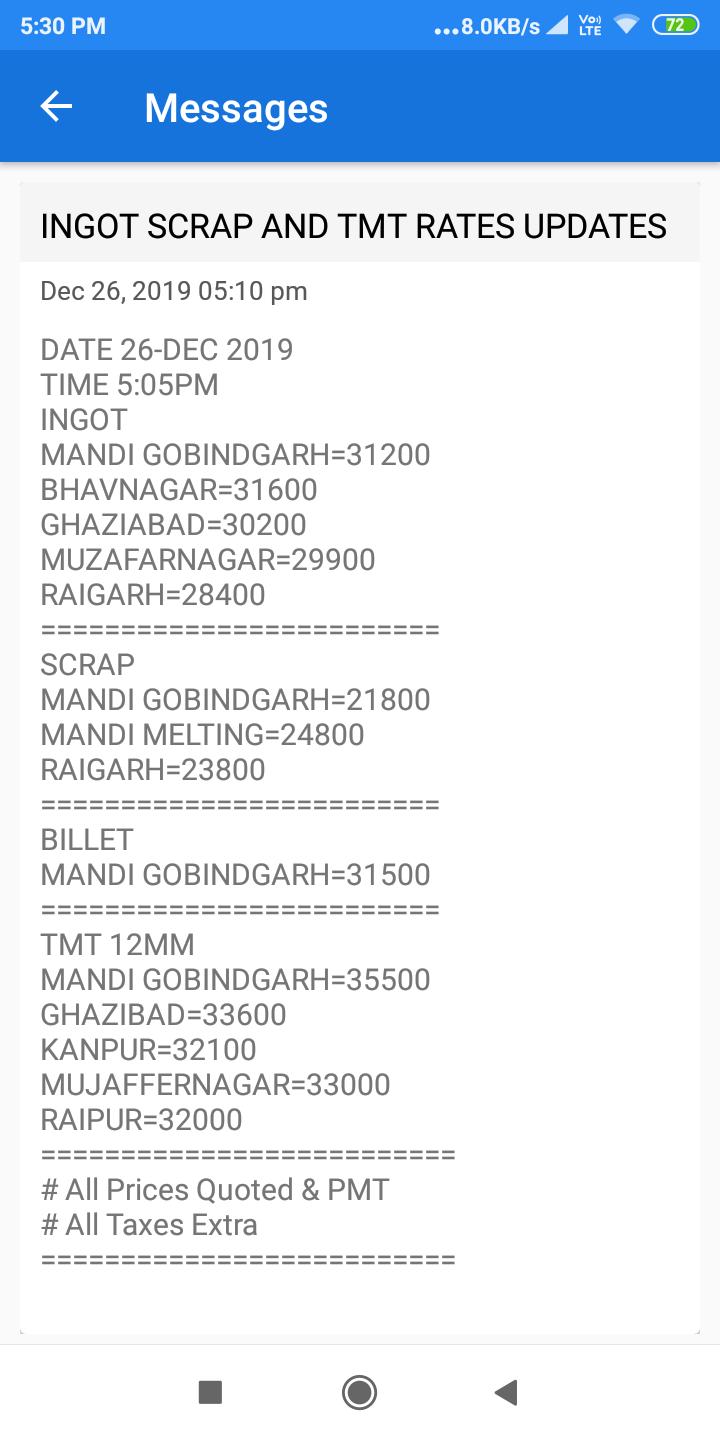 Steel Market Alerts is also providing Iron and Steel Price live on market Iron Scrap, Finished Goods, Alloys, Rolling Materials, Iron Ore, Spong Iron, Cast Iron, Commodity, Currency Rates, Gold, Silver, Metals of cities like Mandi Gobindgarh, Raipur, Ghaziabad, Mujafar Nagar, Alang, Raigarh, Patna, Orrisa, Kolkatta, Mumbai. Indore, Pune, Hyderabad, Himanchal Pardesh, Jammu & Kashmir, Bhiwari, Durgapur, Nagpur, etc. This SMS service is provided to both Domestic and International clients. And each day the company sends out 10 SMS for each Group to all the clients.