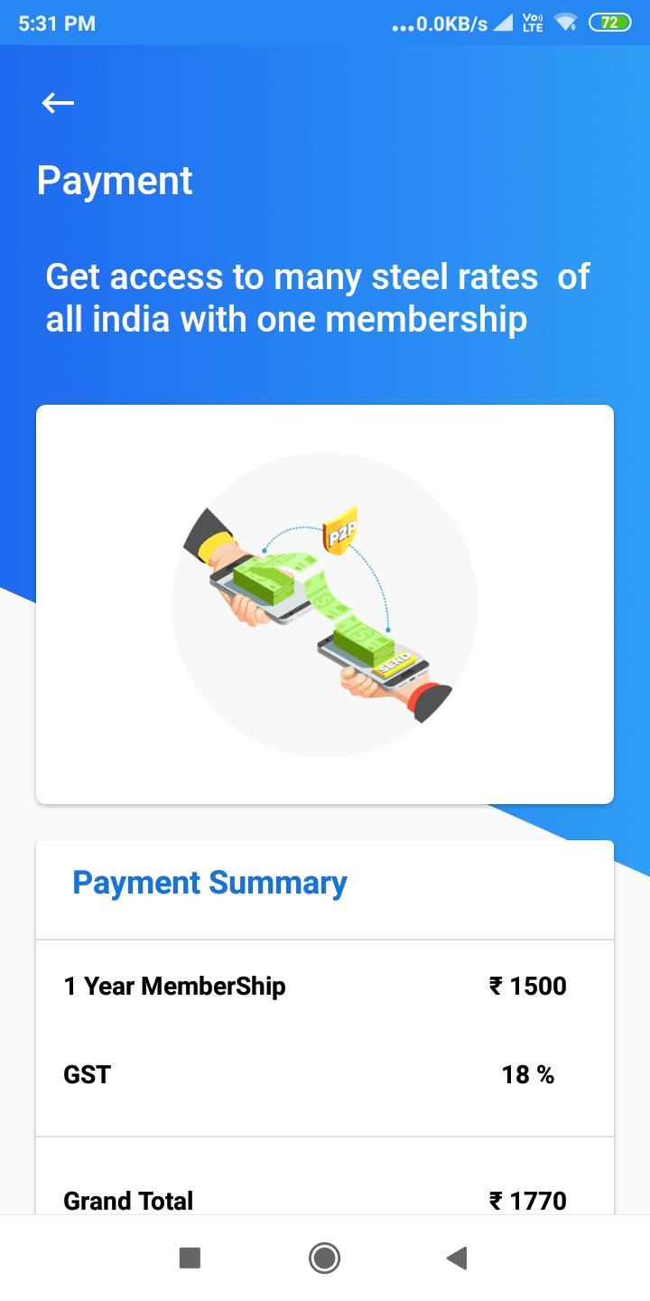 Subscribe our application with annual fee charges to continue your service and get the latest rates of steel items. Hurry and pay only 1500 per annum without GST and included 18% GST you need to pay 1770 per annum.