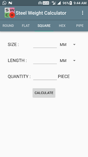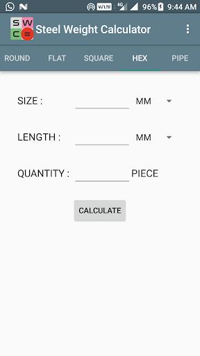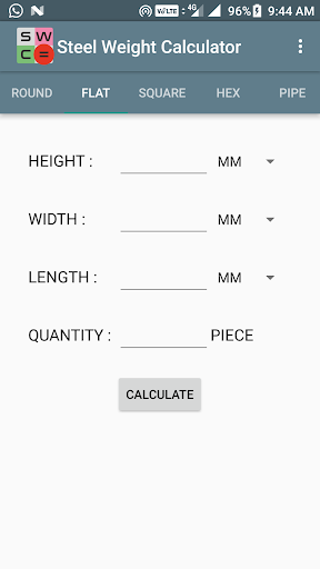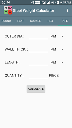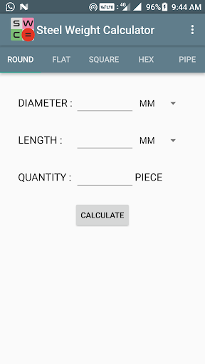This app calculate weight of various shapes 1. Round 2. Flat 3. Square / Flat 4. Hex 5. Pipe Round