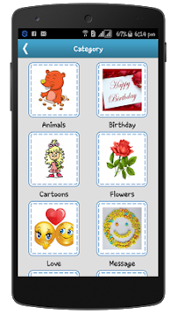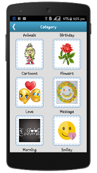 - 9 Categories including Smileys, Emotions, Animal, Love, Messages, Cartoons, Good Morning, Birthday etc.