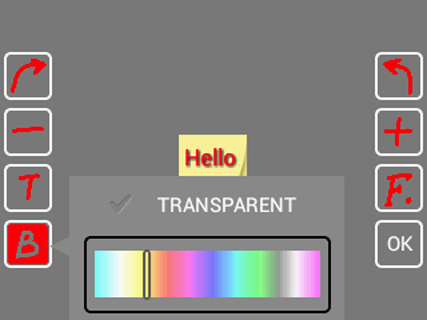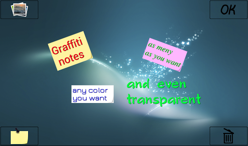 In order to create a record run the application. Select the background. Write message. And click OK. And mark appears on the wallpaper of your phone. Want to add one or change the old notes? No problem! Run the application and make a wallpaper with anything you want. You can change the font, the angle, the background color of the sticker, color and size of letters. Background notes can be made transparent. Add and delete notes in any quantity. Move the stickers on the screen as you wish.