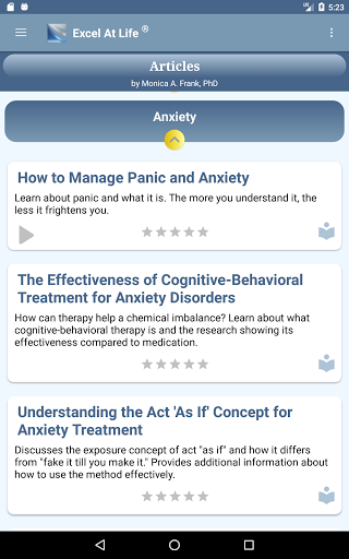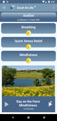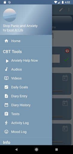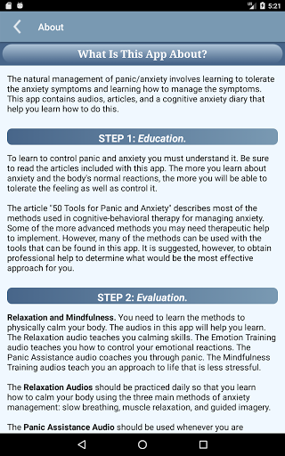 Learn about the methods used to manage panic and get relief from anxiety. Relaxation, mindfulness, and teaching audios. Mood log and analysis, cognitive diary, healthy goals & more!