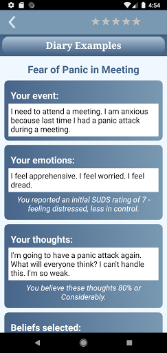 This app provides education to be an informed consumer of mental health services and contains resources to use in collaboration with a health professional. Prior to using CBT methods you should consult with your physician as sometimes panic and anxiety may be related to a physical condition.