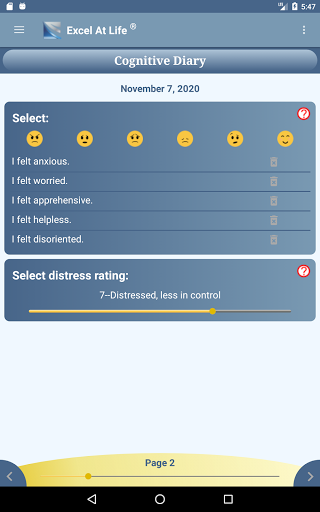 These CBT methods can be used as self-help for minor issues or can be used in collaboration with your therapist to develop a treatment plan best suited to your situation. The Daily Goals feature can be used to record your plan and completed activities.