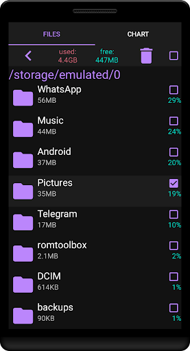 At this time it's the most advanced and interactive disk usage visualization cleaner on Google Play. This application is an essential addition to any file browser.