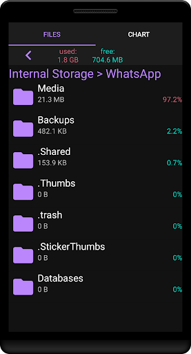 ● The CHART tab is an Intuitive and effective way to display the data on the device. Simply drill-in and you will discover the inner data universe. If you have used WinDirStat, Linux Baobab, Daisy Disk, Disk Space Fan, or TreeSize you are welcome!