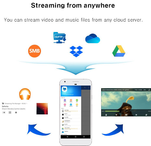 - Streaming (you can stream and play media files over SMB,FTP,Google Drive,OneDrive)