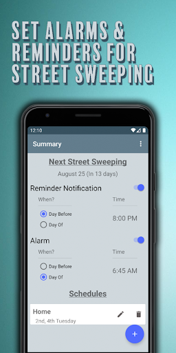 Supports multiple schedules for when you have sweeping on different days for different sides of the street. See the User Guide (available from the Help menu) for more information.