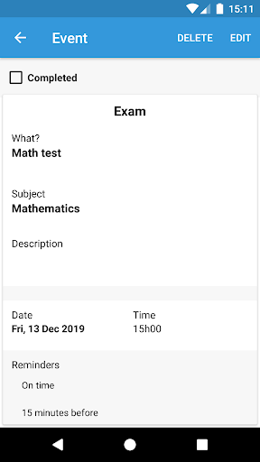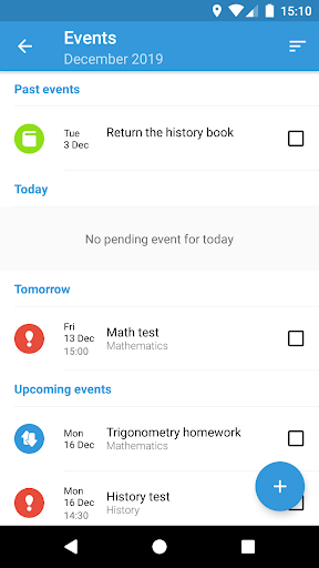 On Student Calendar, important information about tests, homeworks, appointments and timetable will always be available on your smartphone to checks and new schedulings, wherever you are. There are also the reminders (with alarms and notifications), that will help you don't forget important activities.