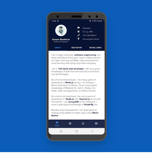 ' Suman Bhattarai - A Portfolio App ' is a personal portfolio app to demonstrate the work I've done as a software developer. It consists of about, portfolio, blog, and contact section.