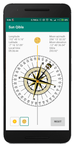 The application to find direction of qibla and direction of north, east, south, and west from your location using sun or moon position. This application need device's location access for the calculation.