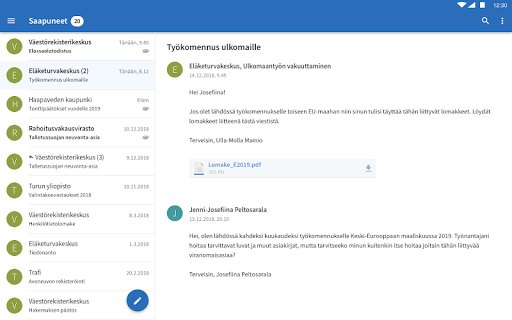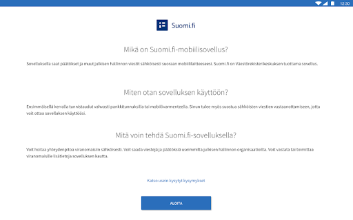 The Suomi.fi application allows citizens to access messages, decisions and other important messages submitted by the authorities electronically and directly to their phones. Citizens no longer need to wait for a letter to arrive and file papers into folders. Instead, all your official mail can always be easily found in one electronic channel. Communicating with the authorities has never been this straightforward. You can also use the Suomi.fi app to submit additional information to the authorities, for example relating to an application you have filed. Messages between your phone and the servers will be encrypted – ensuring that the use of the Suomi.fi app will be reliable and secure. The service is provided by the Digital and Population Data Services Agency.