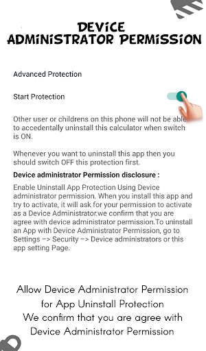 By Start Protection, You will be asked to activate Device Administrator Permission for this app. Super Clock-Timer Lock App uses device administrator permission for prevention of accidentally Uninstallation and nothing else.