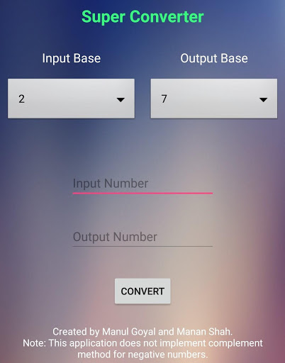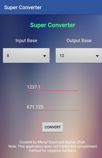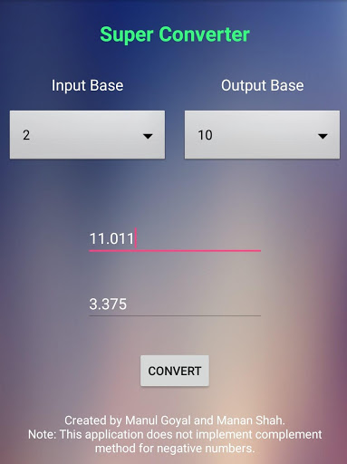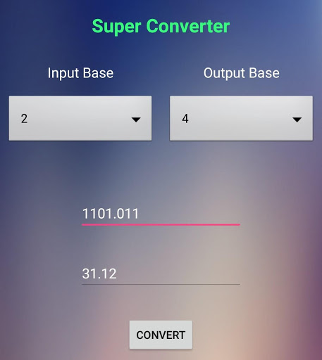 This app can be used to convert numbers from one base to another (base ranges from 2 to 10). This does not restrict the user from converting only integers, it also converts fractional numbers.