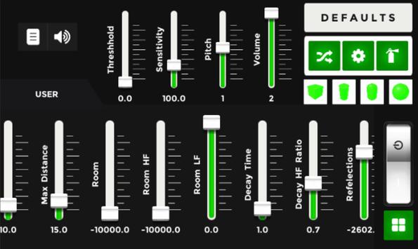 Control in the volume, pitch, sensitivity, stereo pan, spatial blend 2D/3D...