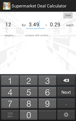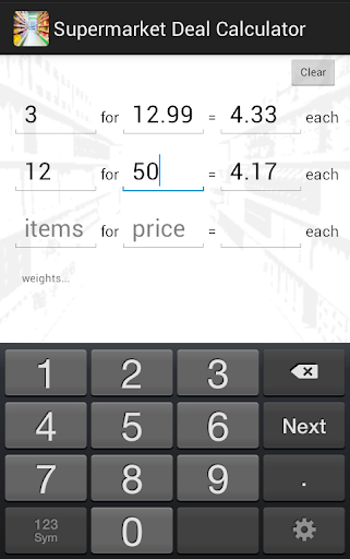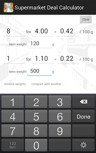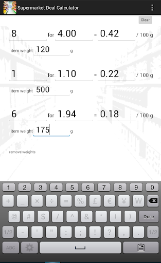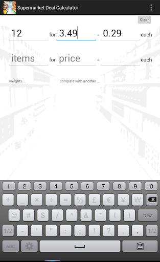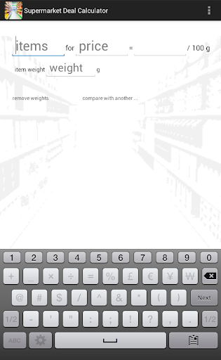 A potentially very useful little shopping helper ... BUT the tiny field labels are very unhelpful, and the numeric keyboard needs the option (at least) to be calculator-style in layout (i.e. numeric keypad) instead of dialing layout (= phone keypad).