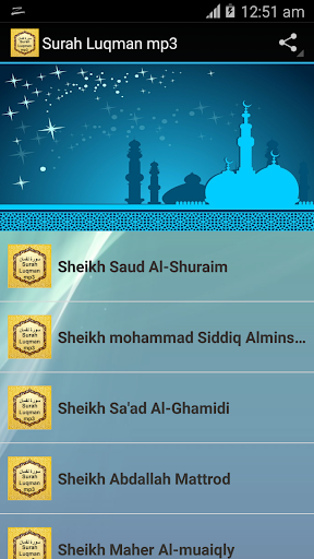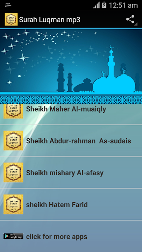The app lets user to listen the audio version of Surah Luqman with different famous reciters. The app is build alone to ease memorise for user by frequent listening. You can also click on google icon in the dashboard of the app to direct you to many Islamic apps including complete recitation of complete holy Qur'an.