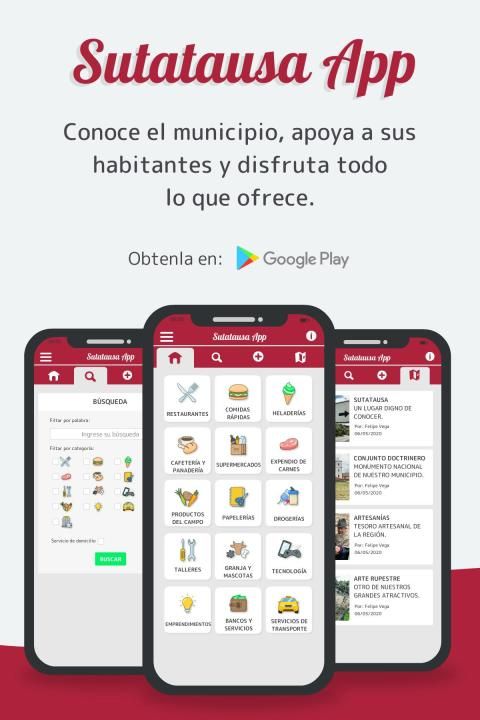 Está es la primera versión de lo que será una App que reúna: información, comercio, turismo, empleo y muchas más funciones de beneficio a Sutatausa y su comunidad.